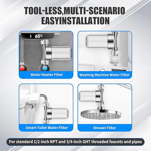 - 【Extend Life, Save Time and Money】This water filter for washing machine, heater, toilet, shower, sink, faucet, ice maker, RV, and garden prevents clogging, rust, and corrosion. By reducing maintenance needs and protecting equipment, it saves you money and provides better water quality every day.