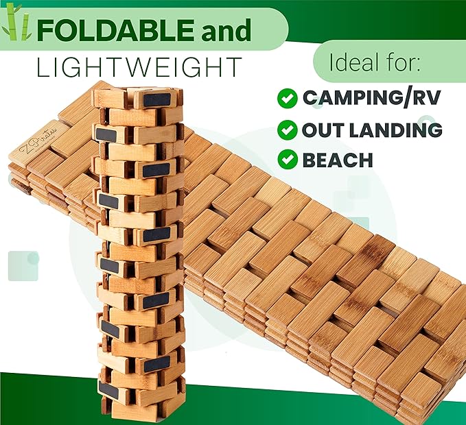 - Compact, Foldable and Portable – Measuring 24" x 16" with a 0.4" thickness, this bamboo mat fits perfectly outside showers, hot tubs, and doorways without being bulky or intrusive. Foldable and lightweight, making it convenient for outdoor showers, camping trips, or as a portable step mat on sandy and grassy grounds.