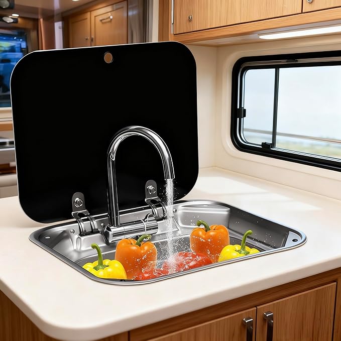 - 【Worth it】A full set of equipment for RV sink with lid cover include 306°folding faucet + mounting hardware+ cold hot hose + drain+ strainer. The sink with a hole to receive a fold down the faucet (with cold&hot water faucet).Drop in sink drainer is designed to sit flush in RV countertops where space is limited. rv sink with cover, kitchen bar sink rv kitchen sinks caravan rv sink camper van sink single bowl sink rv sink faucet kitchen bar rv sink and faucet combo