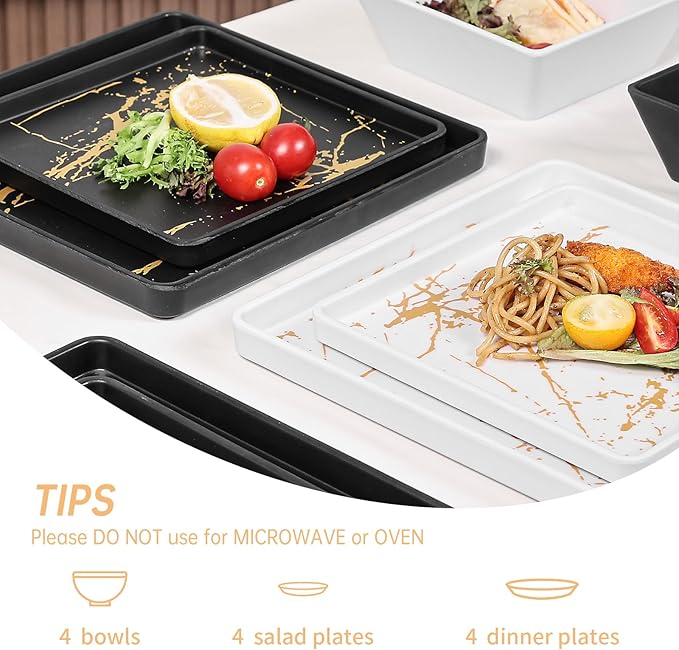 Square Melamine Dinnerware Sets of 12 Pcs,Square Plates and Bowls Sets,Unbreakable Dish Set for 4,Lightweight, Dishwasher Safe and BPA Free,Suit for RV,Camping (Black and White)